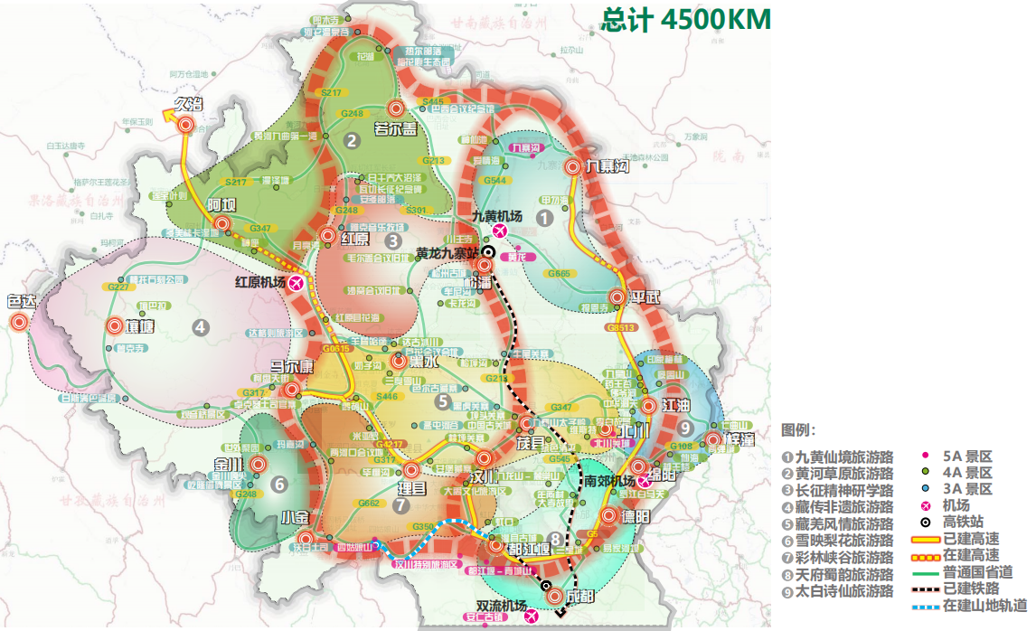 大九寨环线交旅融合策划方案以“三环九珠”为总体布局,串联阿坝州、成都、德阳、绵阳等地,涵盖九寨沟、黄龙等6个5A级景区和47个4A级景区。秉持 “交通支撑文旅、文旅反哺交通” 理念,构建 “快进慢游” 体系,形成九类主题子线,包括长征精神研学路等红色主题线,九黄仙境旅游路等自然风光线,以及藏羌风情旅游路等人文风情线,通过完善交通基础设施、提升服务功能、打造特色游线,实现交通与旅游深度融合,推动区域经济发展。
